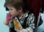 The boy is settling well in his class. They have a nice little routine. Every week they do some cooking and Pwd comes home with a little bag of blobs that I think are supposed to be either biscuits or cakes – the texture is somewhere in between. Not sure how much of a part he plays in making them but I bet he likes getting his hands in the flour. After the first week’s art class we had to give his hair a cut. They’re making a collage of some sort and Pwd had glued bits of his floppy fringe to his head. It needed doing anyway but we’d been putting it off because of the inevitable meltdown that accompanies a trim.
