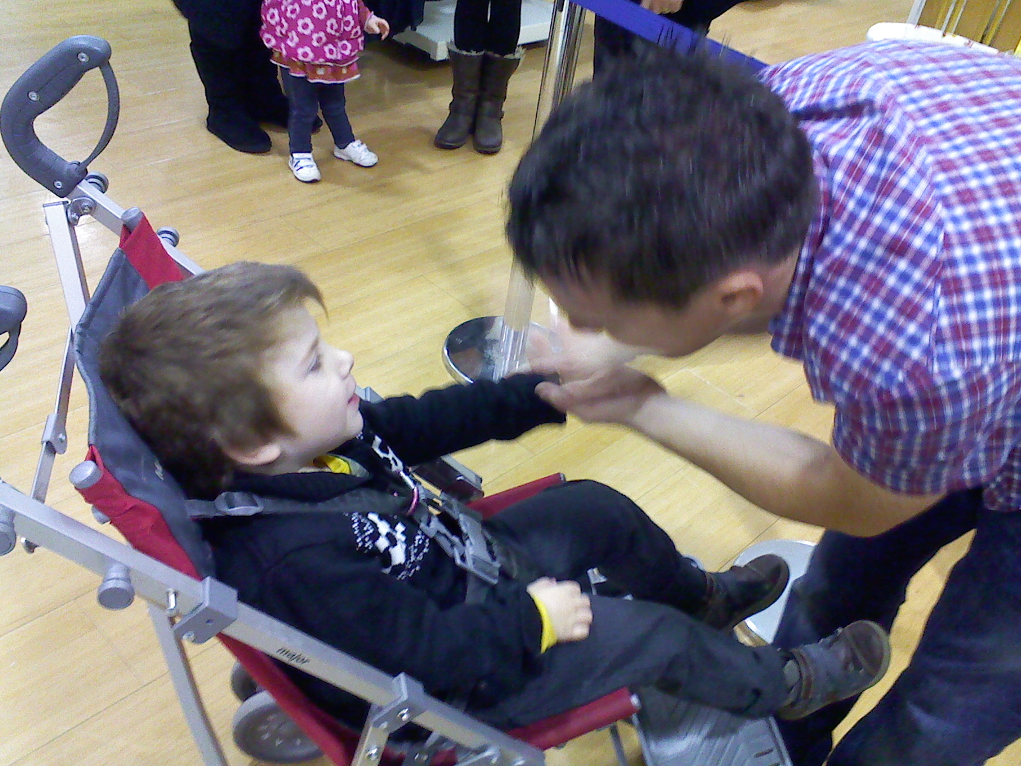 In order to teach Troy to walk, I would place his hands on my hips, Troy standing behind me, and I would “Cha, Cha” him around the house. I wanted him to understand the hip movement required and since he never learned to commando crawl or for that matter crawl, this was my homemade OT/PT resolution. Several years later and the independant walker he became, we were standing in line at a restaurant. He proceeded to touch the younge female University student’s hips, to which she proceeded to turn around, see Troy, remark “ewwwww!” and wipe her hips.